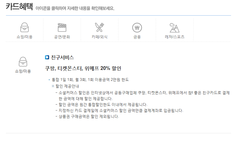 쇼핑/미용은 쿠팡, 티켓몬스터, 위메프에서 일 1회, 월 3회 한도로 20%의 할인혜택이 주어집니다.