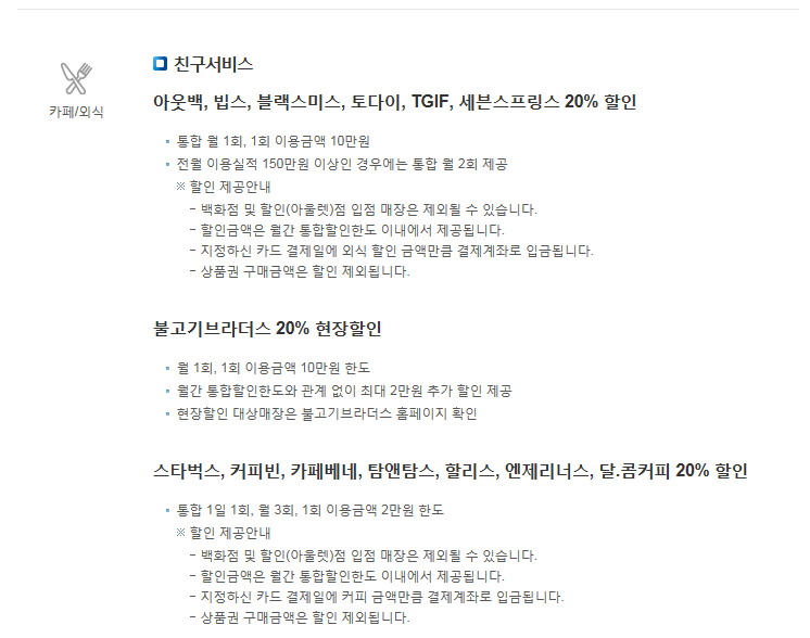 카페/외식에서는 아웃백, 빕스, 블랙스미스, 토다이, TGIF, 세븐스프링스에서 월 1회 20% 할인, 불고기브라더스는 20% 현장할인, 스타벅스, 커피빈, 카페베네, 탐앤탐스, 할리스, 엔제리너스, 달콤커피에서 일 1회, 월 3회 한도로 20% 할인이 적용됩니다.